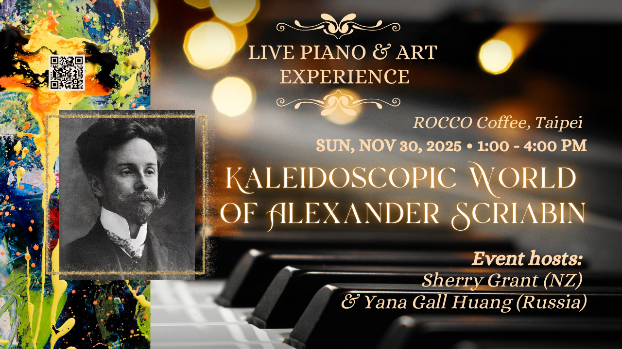 Taiwanese-born New Zealand concert pianist Sherry Grant and Russian-born emotional wellness coach Yana Gall Huang sincerely invite you to an afternoon workshop where live performance of piano music by Russian composer Alexander Scriabin (1872-1915) inspires live creation of artworks. This live event is brought to you by the International Scriabin 2025 Festival to commemorate the 110th year since the composer's death and children are welcome to register and paint along with their parent(s). Seats are extremely limited, first in first served.