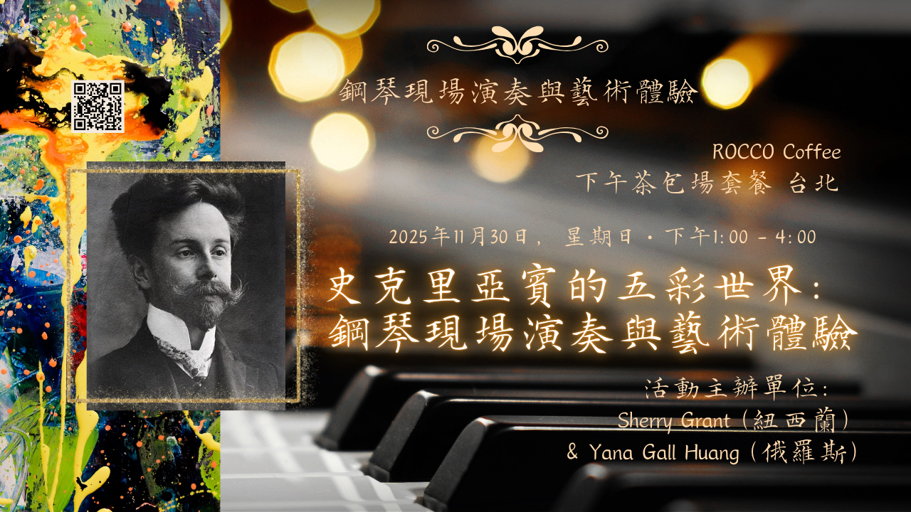 紐西蘭鋼琴家陳美如(原籍台灣)與 台灣靜心繪畫導師蓋亞娜(原籍俄國)誠摯邀請您加入她們合辦的音樂藝術創作工坊,在享受下午茶的同時,聆聽俄國作曲家史克里雅賓五彩繽紛的鋼琴作品,並創作手工畫。本次活動為2025年史克里雅賓國際音樂文藝節的一部分,歡迎親子一起報名參加,座位有限,先到先得。